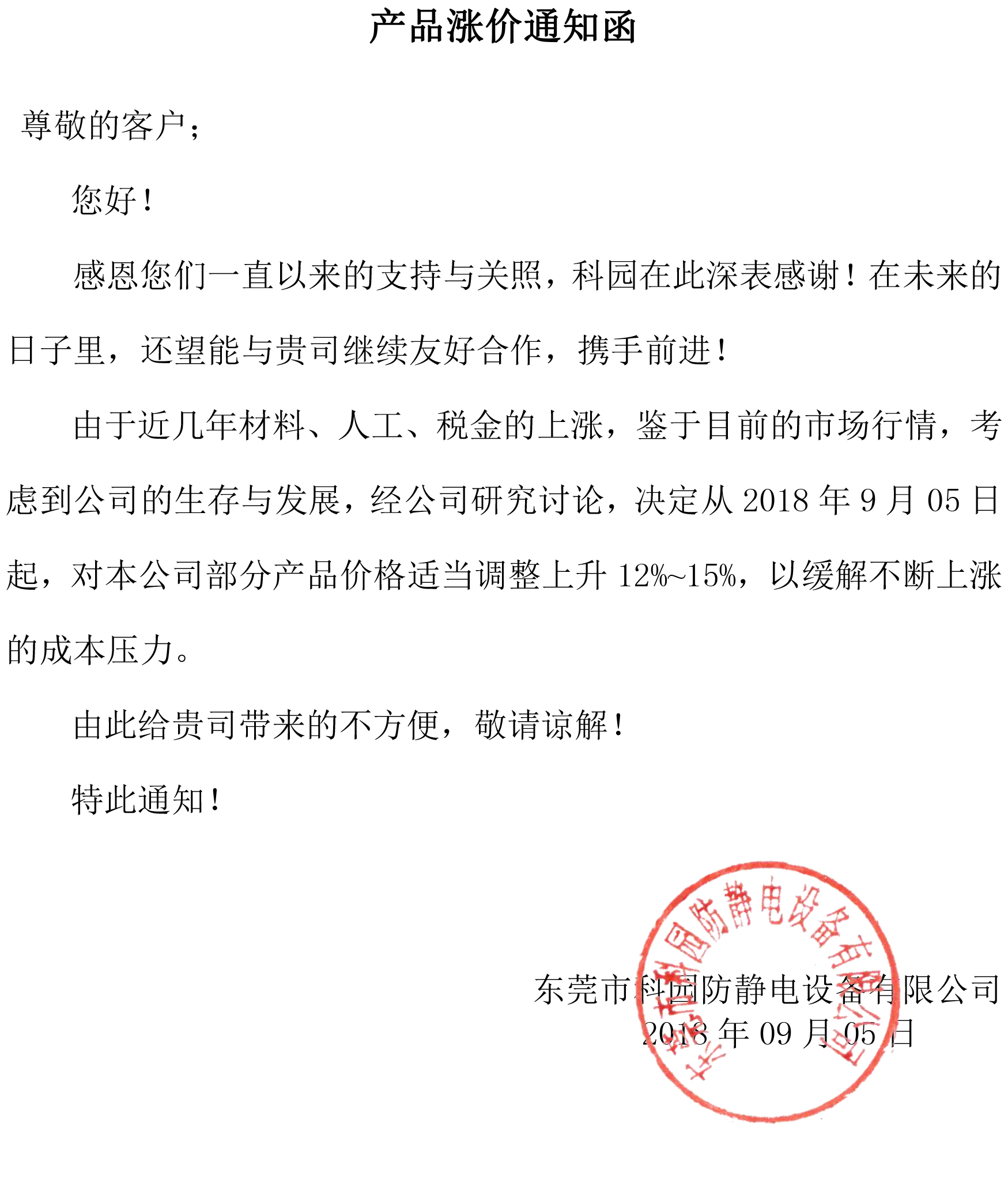 由于近幾年材料、人工、稅金的上漲,鑒于目前的市場行情,考慮到公司的生存與發(fā)展,經公司研究討論,決定從2018年9月05日起,對本公司部分產品價格適當調整上升12%~15%...