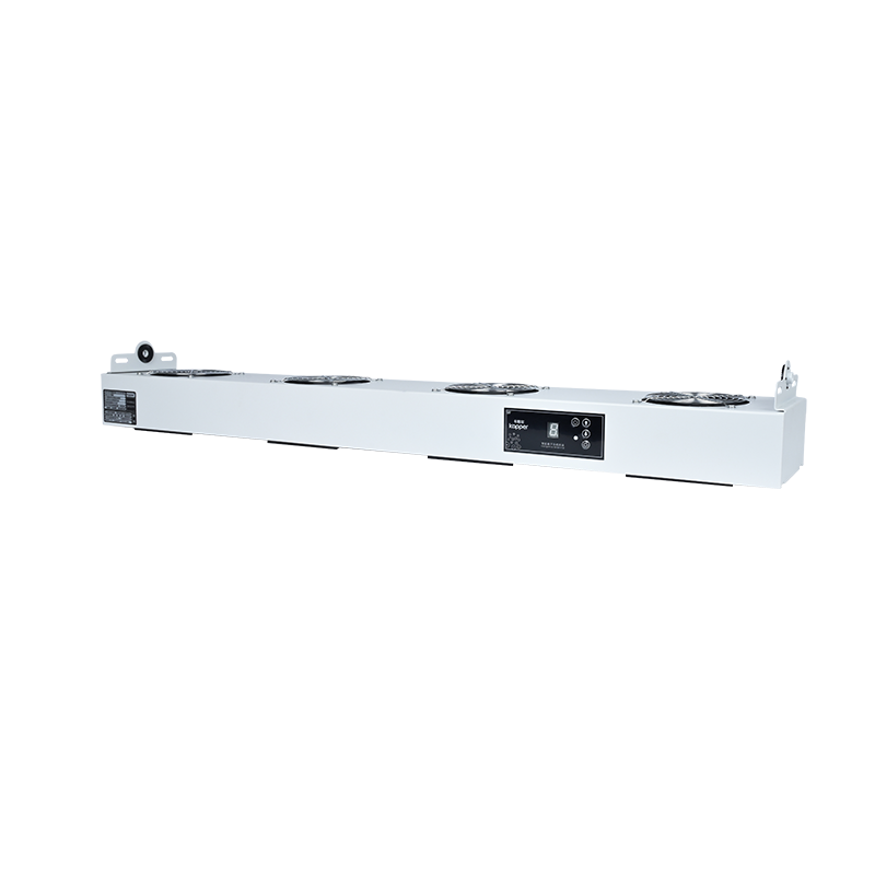 KP1104B 第5 代智能型懸掛式直流四頭離子風機可產生大量的帶有正負電荷的氣流,可以將物體上所帶的電荷中和掉。當物體表面所帶為負電荷,它會吸引氣流中的正電荷,當物體表面所帶為正電荷時,它會吸引氣流中的負電荷,從而使物體表面上的靜電被中和,達到消除靜電的目的。