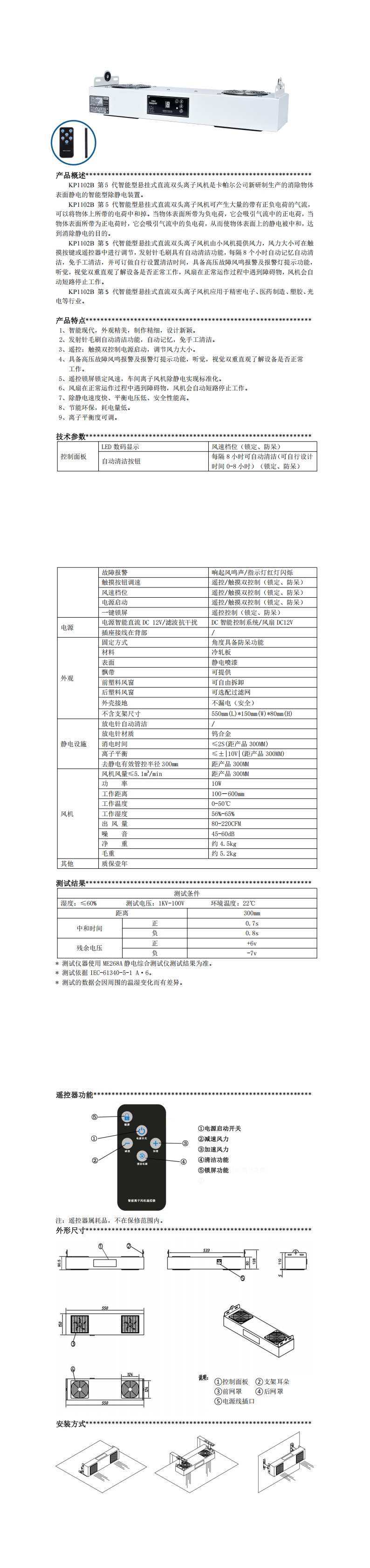 KP1102B 第 5 代智能型懸掛式直流雙頭離子風機