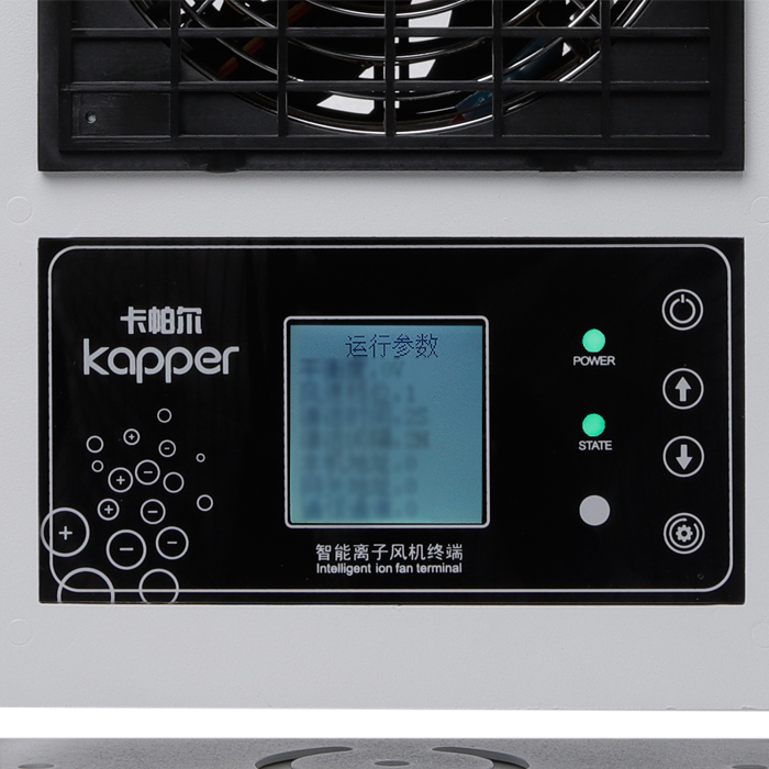 KP101C第六代智能型臺式離子風機由小風機提供風力,風力大小可在觸摸按鍵或遙控器中進行調節。